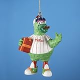 Ornament depicts the Philadelphia Phillies' mascot, the Philly Phanatic, holding a gift box