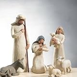 Remember the awe and wonder of the Christmas story each year with this beautiful 6-piece Willow Tree Nativity Set. Set Includes Joseph, Mary, Baby Jesus, Shepherd, Donkey and 2 Sheep. Susan Lordi's art reflects our relationships with people and the world around us. Her keen observation of the human form is further inspired by ballet, modern dance, nature, and her personal experiences with family and friends. These influences are revealed in her Willow Tree? sculptures, from which emotion is communicated through gestures only.Artist Susan Lordi hand carves each original Willow Tree sculpture. Using family and friends as models, Susan tries to capture a moment in time, or express a feeling. Pieces are cast from her original carving, and then individually painted by hand. Softly washed colors, carved and metal accents, and representative icons of nature mark Susan's work